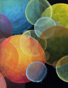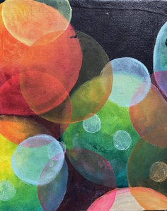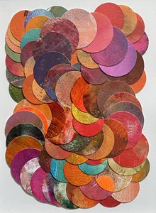 Collage-composities waarin ronde vormen geponst uit zelfgemaakte monoprintvellen, samen een nieuw geheel vormen. De ronde vorm ontstond uit een mislukt project - een toevallige ontdekking waaruit kleine kunstwerkjes groeiden die, eenmaal samengebracht, een groot en levendig kunstwerk vormen.