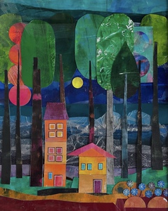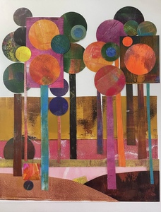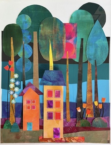 2025Collage geïnspireerd op het bos, opgebouwd uit monoprintvellen met ronde vormen, strepen en huizen.