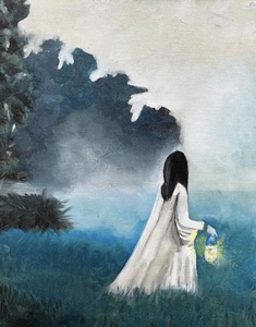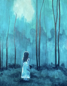 2023Een meisje in een bos, verbeelding van persoonlijke herinneringen.